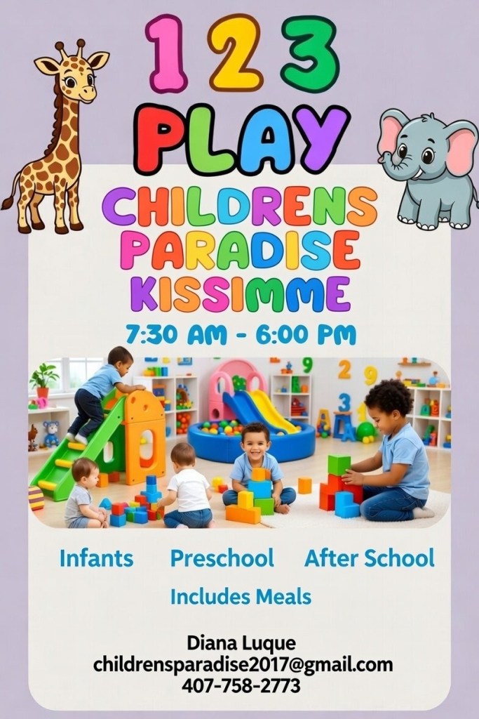 Childrens Paradise Kissimmee offers a bright, colorful day care experience for infants and preschoolers with hands-on learning, caring staff, and inclusive meals.