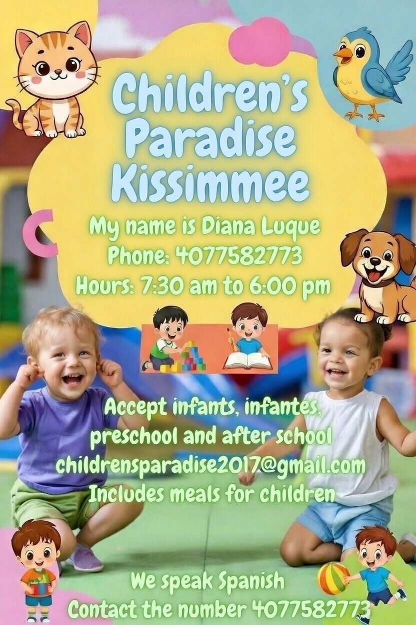 Childrens Paradise Kissimmee offers care for infants, preschoolers, and after-school kids with all meals included, bilingual support, and a safe, playful learning environment.