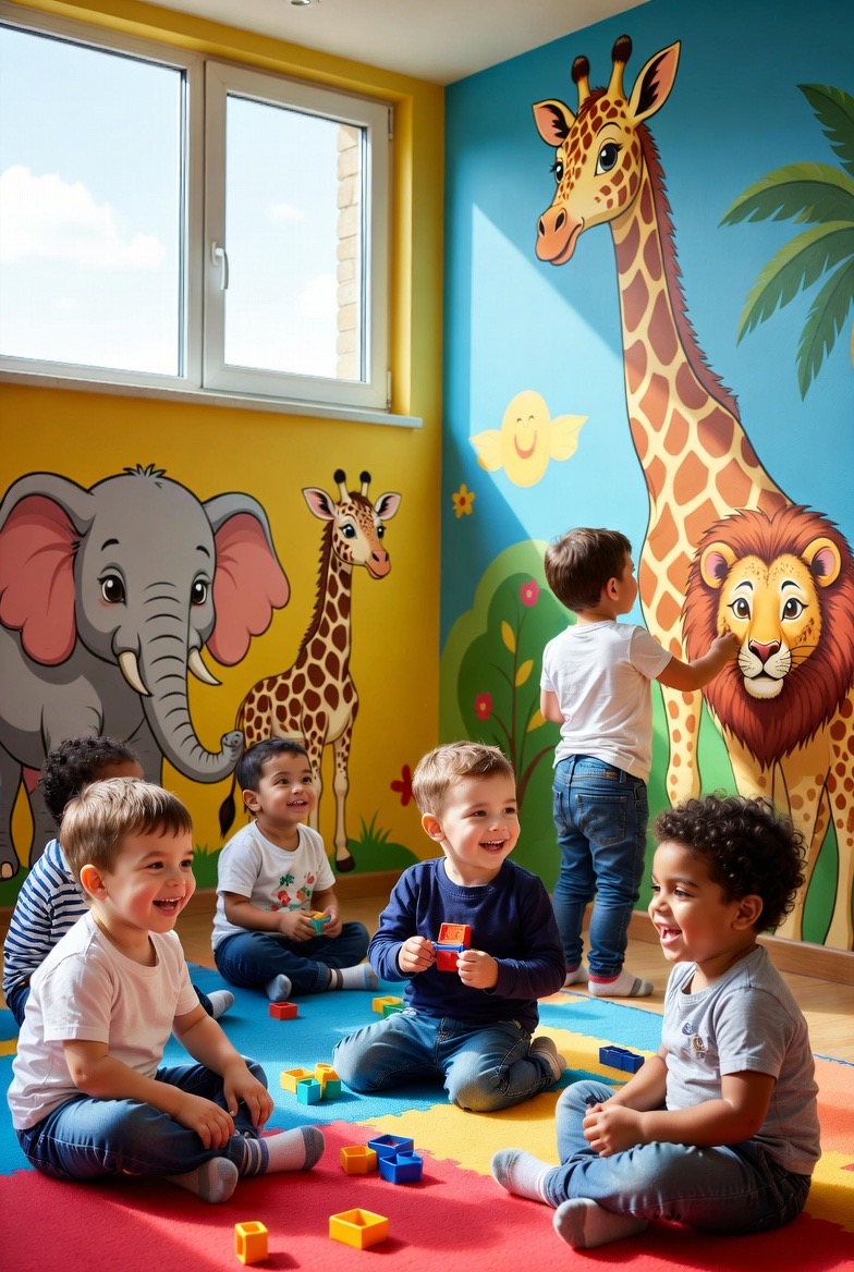 A colorful daycare with animals, numbers, and letters. We offer care for infants, preschoolers, and after-school children with meals included.